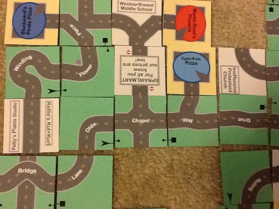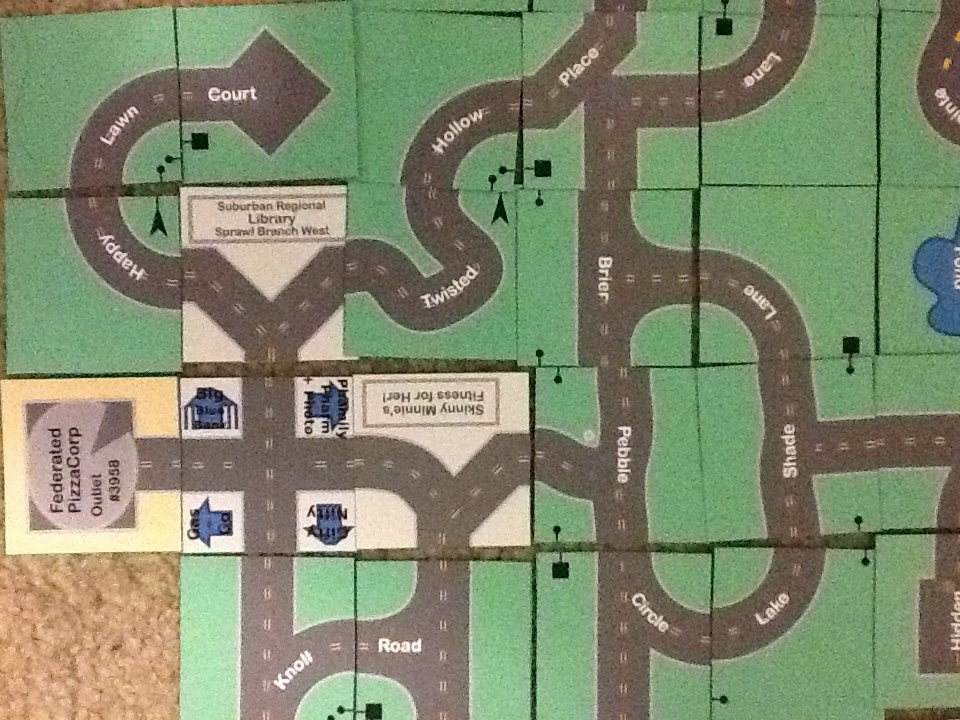 (I realize these are not the most perfect photos I could have taken.  They show what a real layout that you build on your carpet out of tiles printed on ordinary cardstock, with a window fan blowing in the room, looks like, lit by an ordinary overhead light.  I took the photos with my iPad, trying not to cast its shadow or mine over the terrain.  My limited success actually plays up the feeling of confusion I often have about Rambling Sprawl Estates–is it a map or an aerial view?–by adding some shadows like the ones we see in satellite photos.  My iPad and I are clouds….)