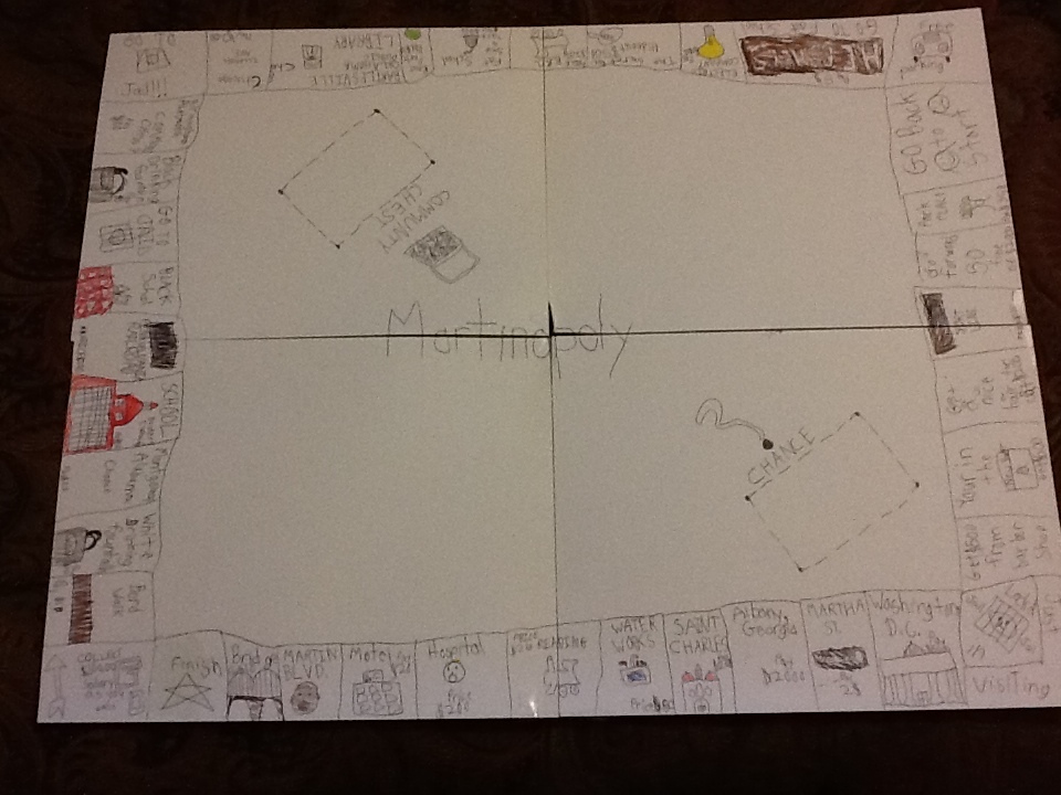 Washington, D.C., was Nick’s own idea because he knew that Dr. King had organized a big march and given a famous speech there. He asked me to name some other places where Dr. King worked; after naming a few off the top of my head, I got a list from Wikipedia for Nicholas to use as he filled in more squares. Instead of the Atlantic City street names used in the original Monopoly, many of the places in Martinopoly are places Dr. King worked against segregation and other places affected by the civil rights movement.