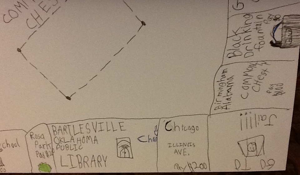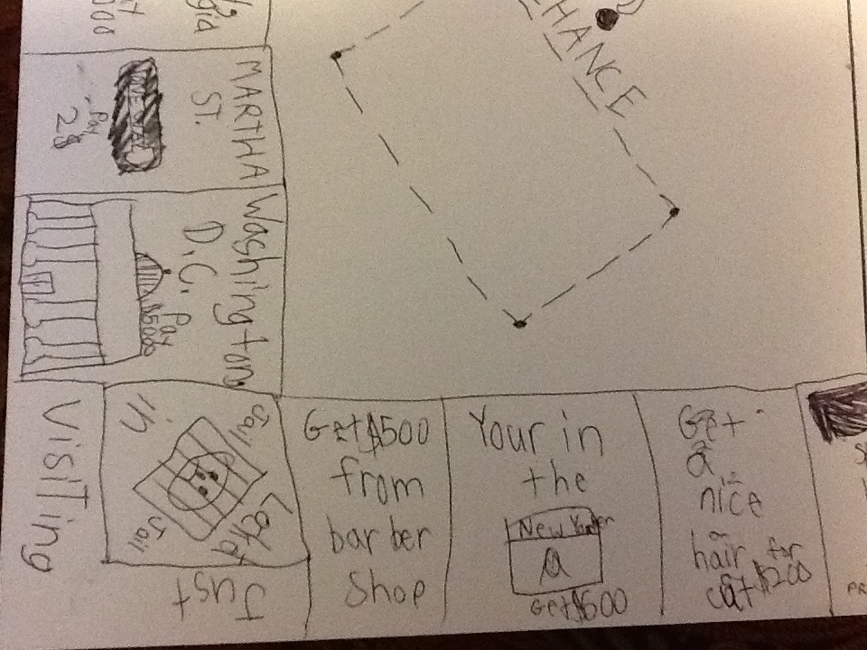 Nicholas hadn’t made any title deeds for the places shown on his board because he was tired–so we couldn’t own property; when we landed on a space, we were just paying rent. This too is parallel to the African-American experience: It was difficult for them to own property, especially in the South, and many were victimized by landlords charging high rents for run-down houses.