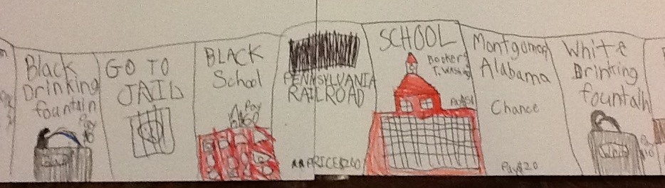 Next he filled in some spaces with separate, unequal facilities. Look at the difference between those school buildings! (When I looked up the name of Dr. King’s high school, at Nick’s request, he wrote it next to the white school instead of the black school. Oh well–it was another opportunity to talk about how these things worked: Martin Luther King, Jr., had to go to the black school, which was named Booker T. Washington after a famous African-American.)