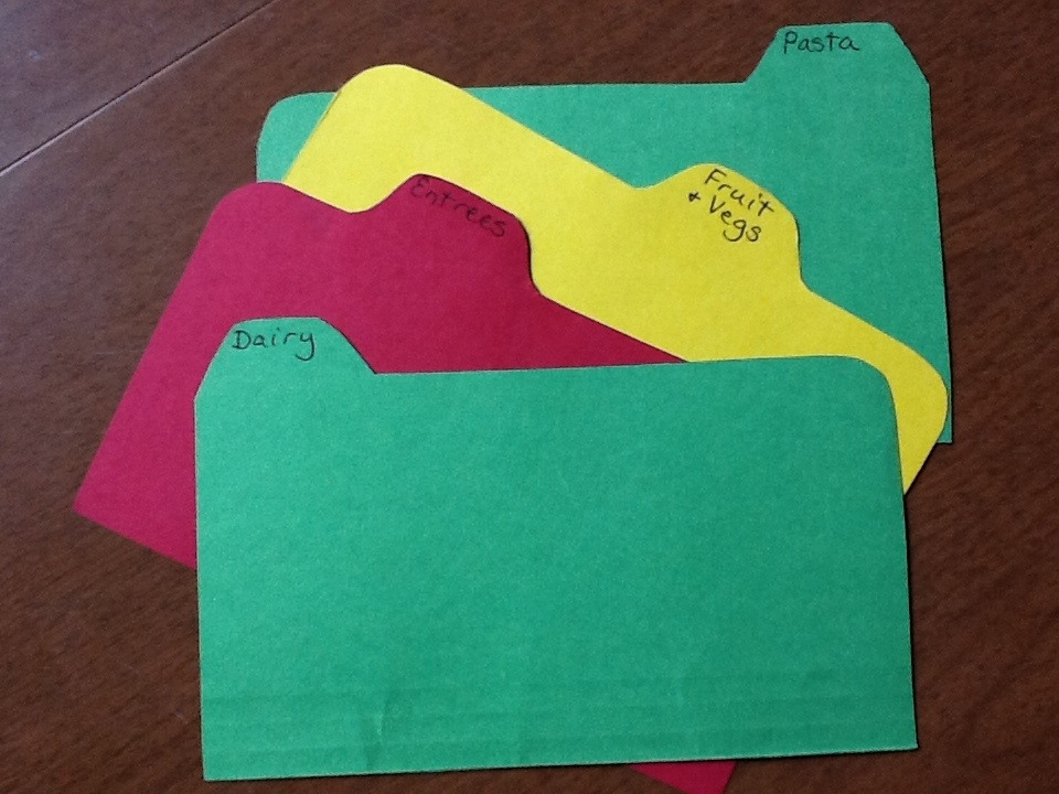 I cut off the original tabs of the file folders because they had kids’ names written on them. I placed one of the old coupon dividers on the unfolded folder, traced around it, and cut it out. Then I refined the shape to make it more rounded. Not only does this look nicer (I think) but there are no corners getting constantly handled and bent. This has worked out well; after 4 years of use, my tabs are in good shape.