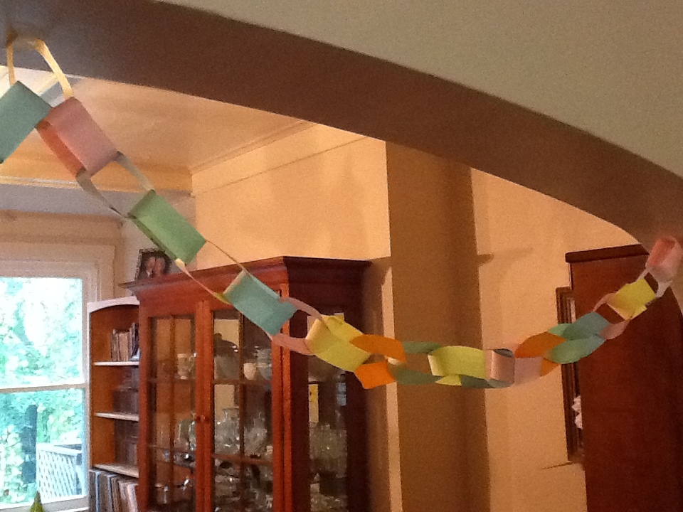 Decorating with paper link chains works for me!  Visit Mom’s Library for more fun things to do with kids!  Visit Waste Not Want Not Wednesday and Green Living Thursday for more ways to use resources wisely!