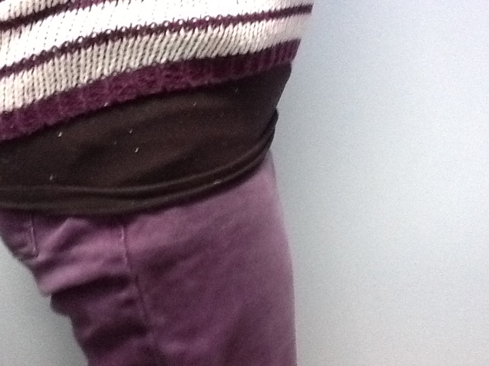 Overall, I think that using a stretchy tummy band to transition from regular pants to maternity pants is an okay idea but has some downsides. (A different brand of band might have better quality fabric.) It worked for me…well enough. I was relieved to get into pants that are comfortable without this pesky extra garment, and I wouldn’t recommend trying to wear regular pants with a band all the way through a pregnancy.