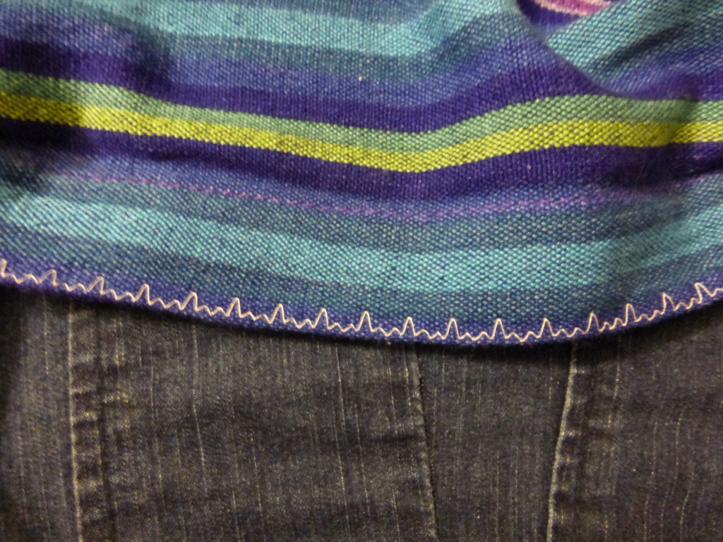One problem, though, is that it can be difficult to recognize which edge of the sling fabric is which. It’s important to put the correct edge underneath the baby so that the fabric is not twisted behind your back–that’s uncomfortable and can injure you if you keep carrying the baby that way. When you reach for the fabric below the rings to adjust the sling, sometimes it’s hard to find any edge, let alone the one you’re looking for, because the fabric is layered in a way that may not be immediately obvious, especially to a busy parent trying to make a quick adjustment while walking.