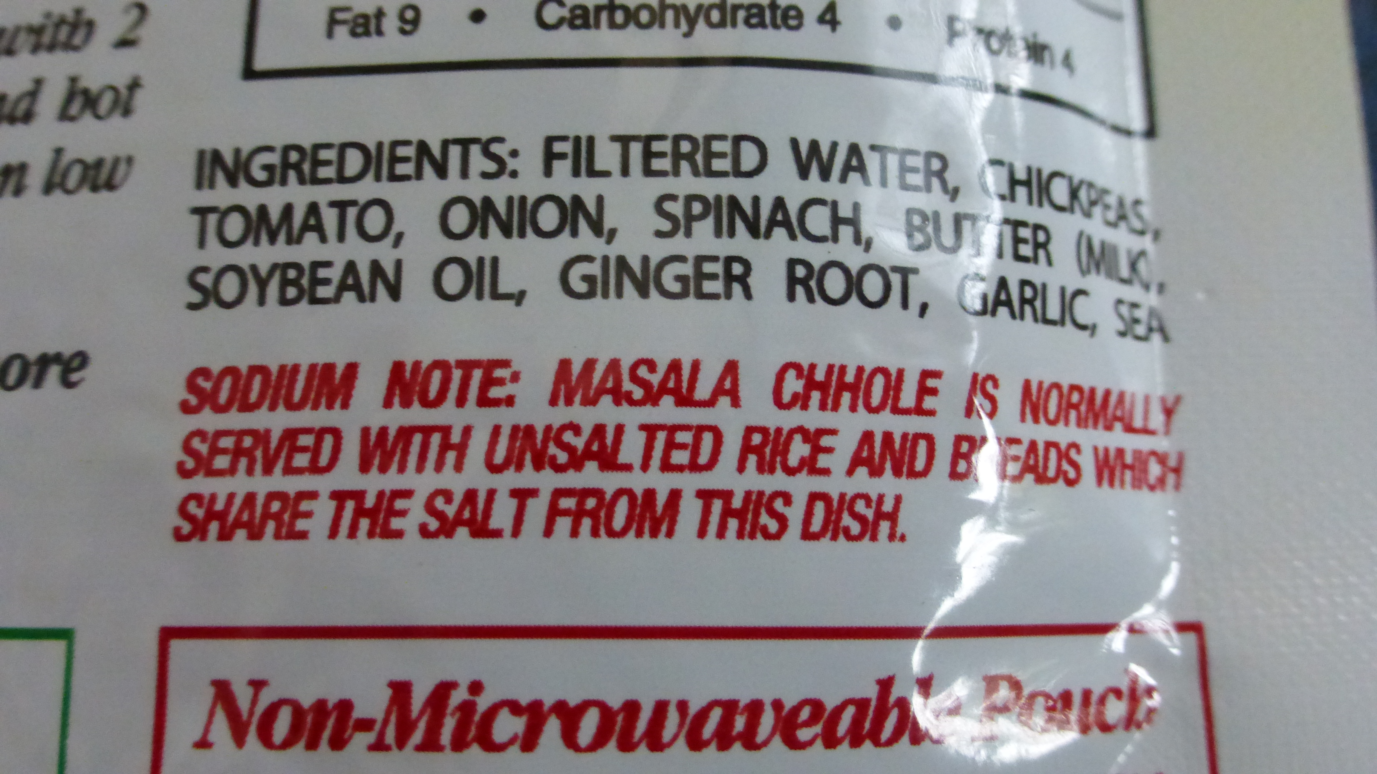 These pouches have Nutrition Facts written as if you were sharing the pouch with another person or two.  As a nursing mom with a fast metabolism, I just eat the whole thing.  That gives me an impressive serving of protein, but it also means a lot of sodium.  I have low blood pressure, so I’m not too concerned!  Notice, in the photo of the Masala Chhole package, the suggestion to spread out the salt with rice or bread–I’ve sometimes managed to bring leftover unsalted rice or plain yogurt to eat with one of these pouches, and that’s a good idea.  If you are looking for a convenient workplace lunch, but you don’t want the calories or sodium of a full pouch, you could close it up (binder clips, found in most offices, are perfect for this) and refrigerate until the next day.