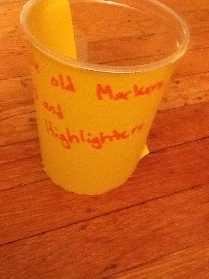 2015/09/img_2540.jpgHere is a close-up of one of the bins.  (Photos were taken by Nicholas.)  They say, “Recycle old Markers, Pens, and Highlighters.”  Many of them also say, “Go Steelers!” or other inspirational messages. 🙂