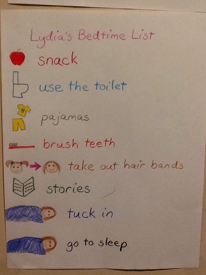 It’s working very well! Lydia likes looking at her List, pointing out the steps and talking about them. She’s more cooperative with the routine than she was before, especially if we get back on track after a distraction by saying, “Okay, what have we done on the List?”
