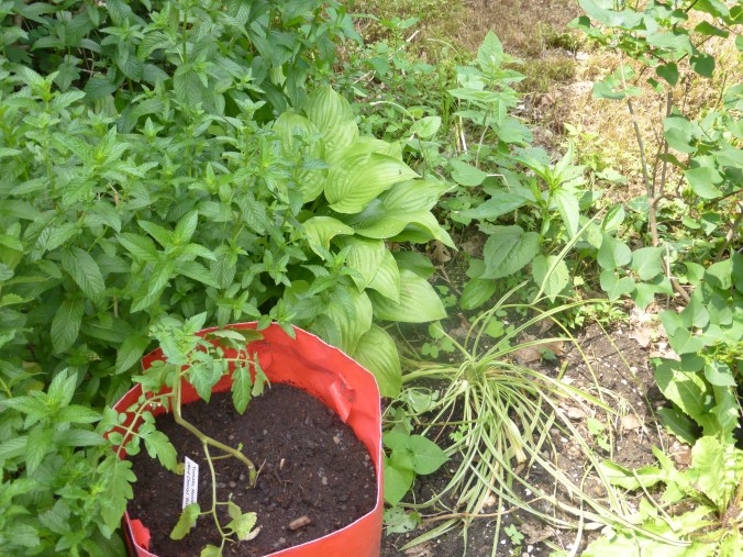 Early summer: a tomato seedling newly planted in a pot, among spearmint, hosta, and spider plant, with black-eyed susans coming up in the background and the lilac bush at right.