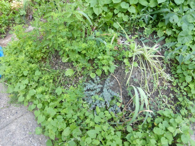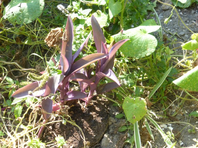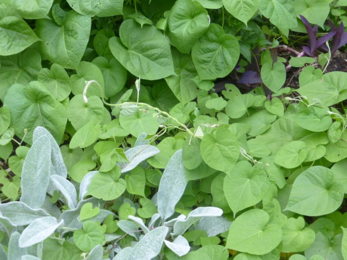 Morning glories, lamb’s ears, and purple vine working together to choke out “weeds.”
