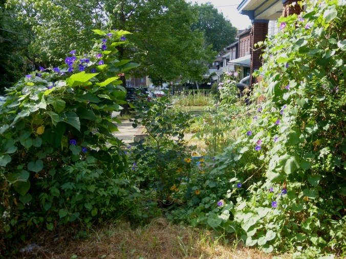 Looking across the neighbor’s yard into mine at peak morning glory season. The vines were using an upstart catalpa tree as trellis on the left and completely covered the privet bush on the right. My lilac bush in the center was carefully kept free of vines.