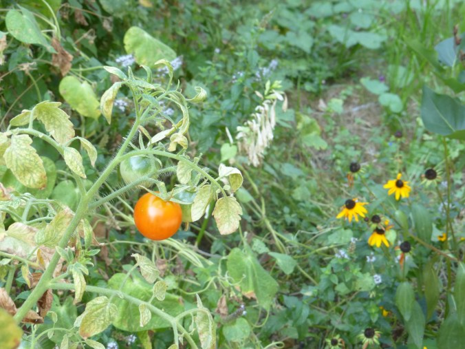 Cherry tomatoes above the little purplish-white daisy-type things, fading hosta blossoms, and black-eyed susans.