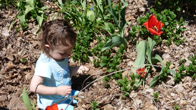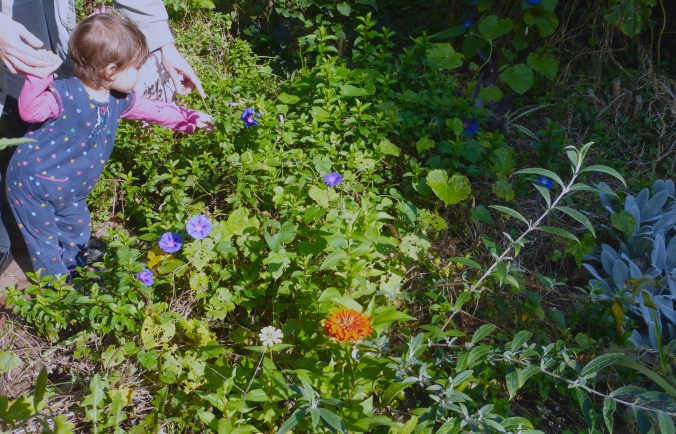 Lydia and Daddy notice a morning glory amid the spearmint and zinnias, near the butterfly bush and lamb’s ears.