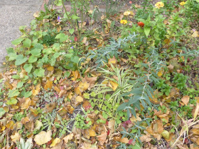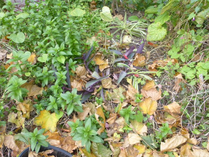 Spearmint, purple vine, and spider plants among the first fallen leaves of autumn.