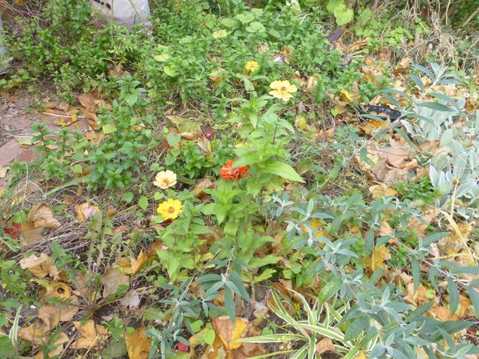 Zinnias growing right in the middle of the butterfly bush, with a spider plant and a few morning glory vines and a dandelion.