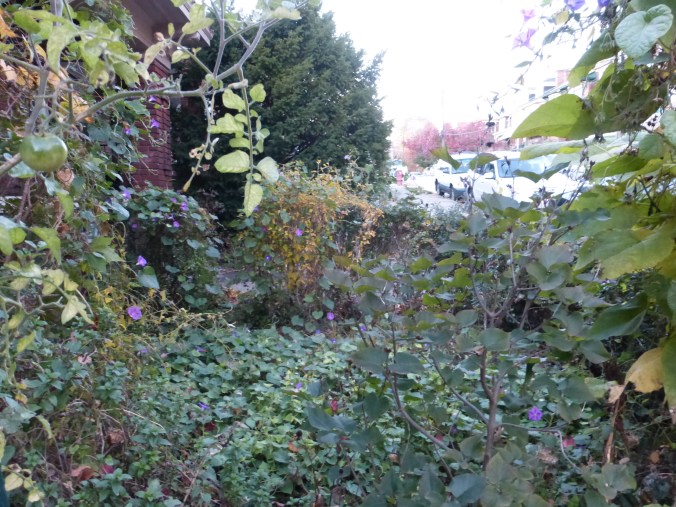 Looking through my garden into my neighbor’s in the autumn, the year morning glories covered the ground.