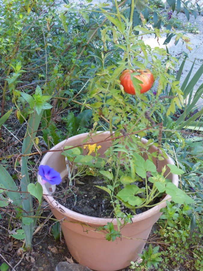 Tomato plant and squash plant in a pot, in the garden among morning glories, irises, spearmint, etc.