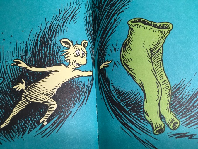 The great thing about a pair of pale green pants with nobody inside ’em is that they don’t have to be any particular size. We could just keep these pants after Lydia outgrows them and use them for every Seuss-celebrating occasion!