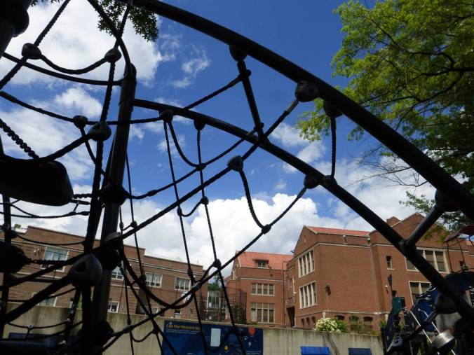 Then I started to notice something: when local playgrounds get equipment upgrades these days, they often add climbing walls. These are usually kid-sized, but Bob O’Connor Playground near our home has a totally vertical wall, maybe ten feet tall, studded with bolt-on climbing holds. The holds are the only really fancy part – sculpted and cast, with a sandy texture. But those can be bought ready-made. The wall is just a plain panel of playground plastic.
