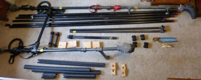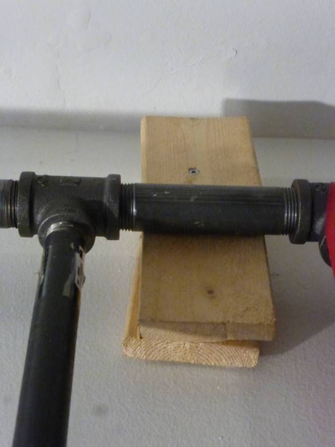 Constructing the frame out of “black iron” plumbing pipe had several advantages: It’s readily available at the hardware store, pretty cheap, in assorted lengths, with T- and L-connectors to fit – even adaptors to connect different pipe sizes. The store will even cut long pieces for you and re-thread the cut ends! So I was able to design the whole thing as a “kit”, with no need for any fasteners or adhesives.