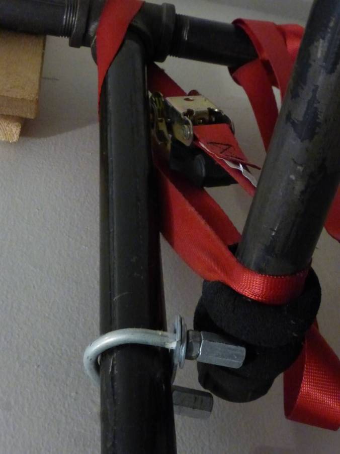 Now, I wanted a pull-up bar in addition to that main “H”, so I had to cheat. A heavy-duty ratchet strap and a pipe clamp hold one end of the pull-up bar in place, in lieu of a real connection. Inelegant, but effective.