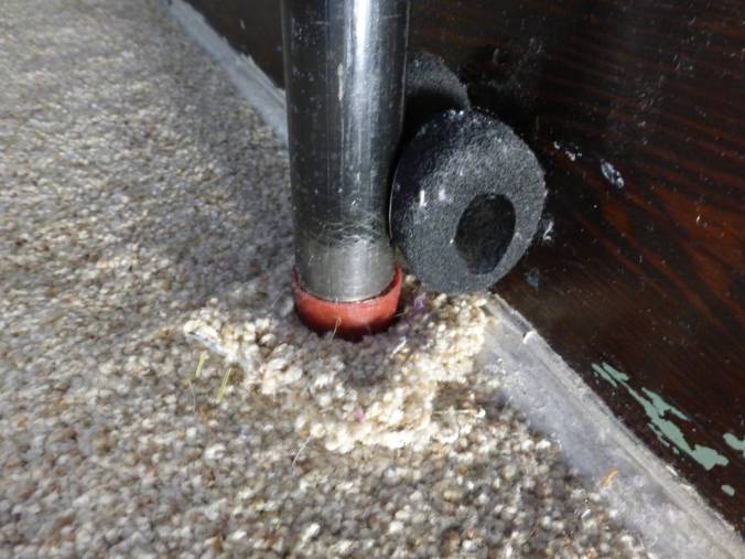 I left the threaded pipes’ plastic protective caps on the gym’s feet. I also put spare carpet scraps beneath them to reduce denting of the carpet and its padding.