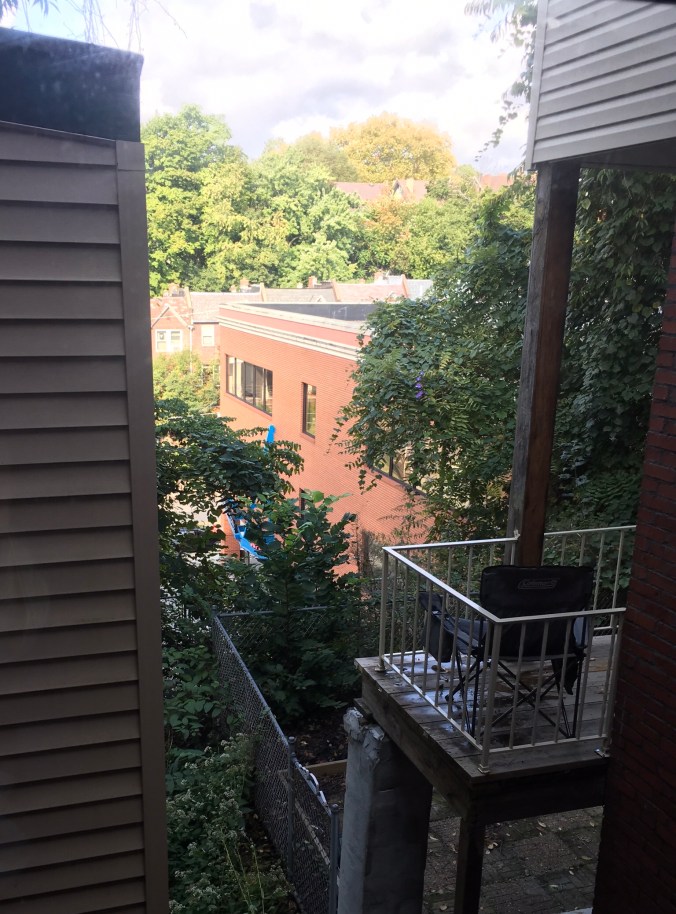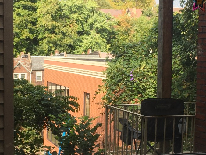 The tree with the morning glories is rooted on the cliff a few feet lower than my basement floor. I’m on my first floor, standing on a chair to get a better angle (and not have to move the window screen). I’m looking over the roofs of buildings in the valley with another hillside beyond. My neighbor’s porch and fence are in the foreground.