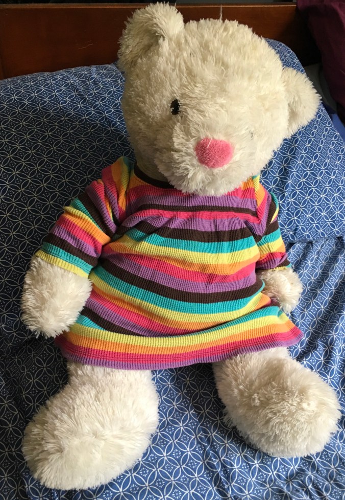 The mother climbed the ladder and dressed the bear in the shirt. It was an excellent fit for a twelve-year-old bear, with room to grow.