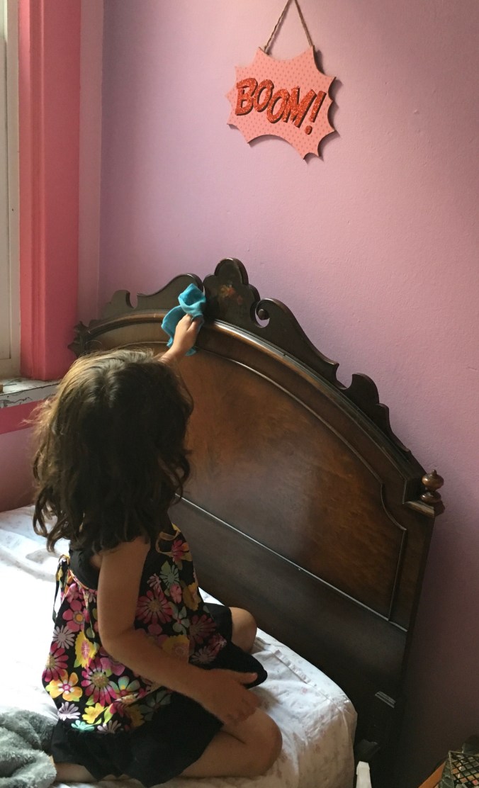 I showed her how to spray the polish on the cloth and wipe away the dust. “See how nice that looks? Your small fingers will be able to get into that groove even better than mine. Here, you try it.” She polished the whole headboard and footboard.