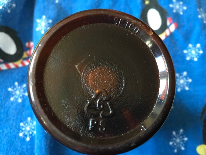 Don’t even try to tell me it’s okay because it’s recyclable. Oh yes, by the late 1990s most consumer-product bottles had their code numbers stamped on the bottom, but this one is a 6, polystyrene. Polystyrene bottles have never been accepted for recycling in any program around here.