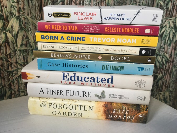 The Forgotten Garden is the only book I actually unwrapped on Christmas morning.  Then I received 5 others from Daniel’s mother at her New Year visit . . . I picked up 2 from Little Free Libraries over the past few weeks . . . and A Finer Future has been in my “to be read” stack for a year, so I’m including it here to hold myself accountable for reading it this year!  (Fiction tends to get my attention more easily than nonfiction.)