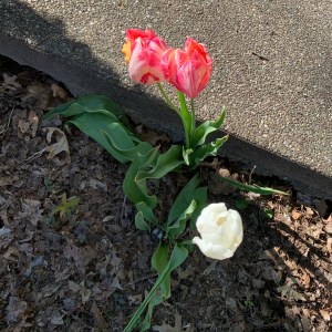 sunlit hedges, tulips, and phlox along a garden wallAnd we don’t even have to stay on our own property!  Here in Pennsylvania, and in most places on Earth, we aren’t and never were forbidden to go out for a walk, in the neighborhood or in the park.  There’s so much to see!  And so many of us have time now to get out of the car and wander through pleasant places!