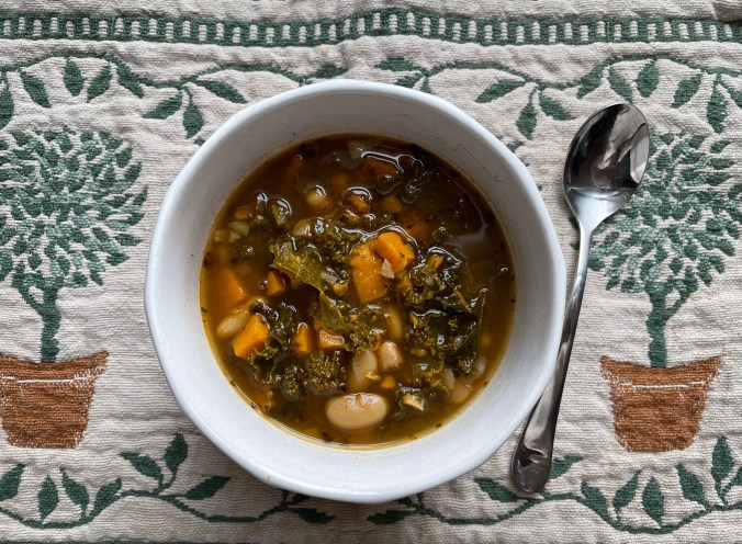 This is a “chunks in broth” kind of soup unless you adjust its consistency. I like to mash some of the beans and sweet potatoes against the side of the pot every time I stir, so that the broth is thicker but some of the chunks are intact. If you’re serving people who object to identifiable ingredients in soup, shred the kale very finely and then purée the soup with an immersion blender.